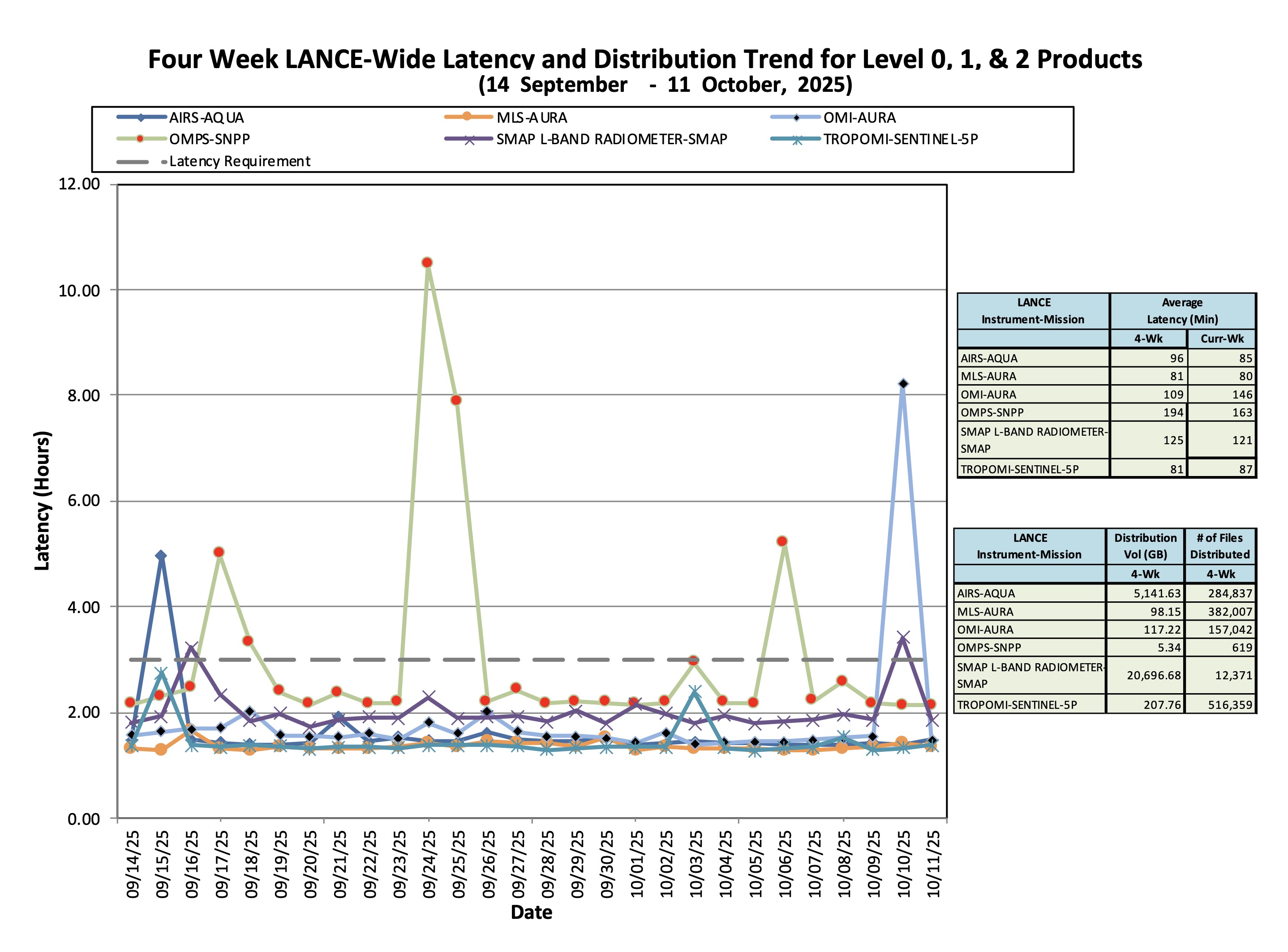 Over the last 4 weeks, over 95% of NRT data requests for all instruments except for 6 instruments (OMPS-SNPP, SMAP L-BAND RADIOMETER-SMAP, VIIRS-SNPP-Land, VIIRS-SNPP-Atmosphere, VIIRS-NOAA-20-Atmosphere, and VIIRS-NOAA-21-Land) were satisfied within 3 hours. OMPS-SNPP, SMAP L-BAND RADIOMETER-SMAP, VIIRS-SNPP-Land, VIIRS-SNPP-Atmosphere, VIIRS-NOAA-20-Atmosphere, and VIIRS-NOAA-21-Land over 87%, 85%, 75%, 91%, 74% ,and 80% of the NRT data requests were satisfied within 3 hours, respectively.